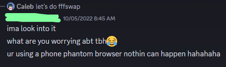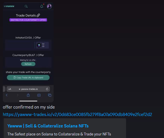 NEVER click links sent in Trade DMs. Use P2P swap platforms to conduct trades like FoxySwap or Yawww. I recommend bookmarking or navigating to these sites via official social media links (Twitter, Discord, Linktree)
